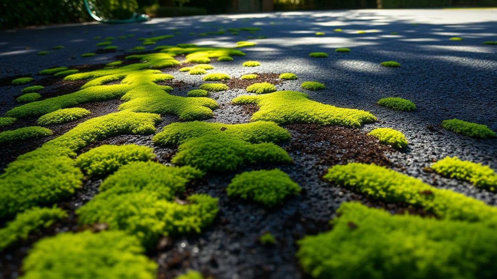 Moss and algae grow on tarmac driveways mainly due to environmental factors and the material’s characteristics. Frequent rain and inadequate drainage lead to moisture build-up, creating a perfect environment for algae. The uneven surface of tarmac, with its pores and cracks, traps water and promotes moss growth. Areas shaded by overhanging trees or parked cars limit sunlight, allowing moisture to linger and encouraging these organisms to thrive. Organic debris, such as leaves, can also collect and support moss and algae proliferation. Without regular maintenance, these elements come together to create a damp, sheltered space where moss and algae can flourish, affecting both the appearance and safety of your driveway. Additionally, ensuring driveways receive adequate sunlight exposure is key to preventing moss growth. Regular inspections and prompt removal of weeds can further mitigate the conditions that foster moss and algae.