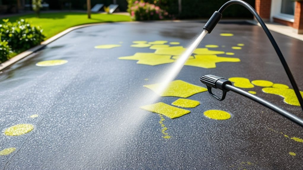 To effectively remove moss and algae from your driveway, it’s essential to use the right pressure washing techniques suited to your surface. Start by choosing the appropriate pressure washer and nozzles. For tarmac, opt for a 40° or 45° nozzle to avoid causing damage. Keep a safe distance and use sweeping motions for an even clean.
